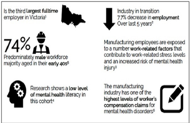 The manufacturing industry is of particular interest to WorkSafe as it is classified as an ‘at risk’ industry regarding workplace mental health. As a predominately male workforce and the third largest industry in Victoria, studies have found the manufacturing industry to have had historically low mental health and wellbeing outcomes due to work-related factors.